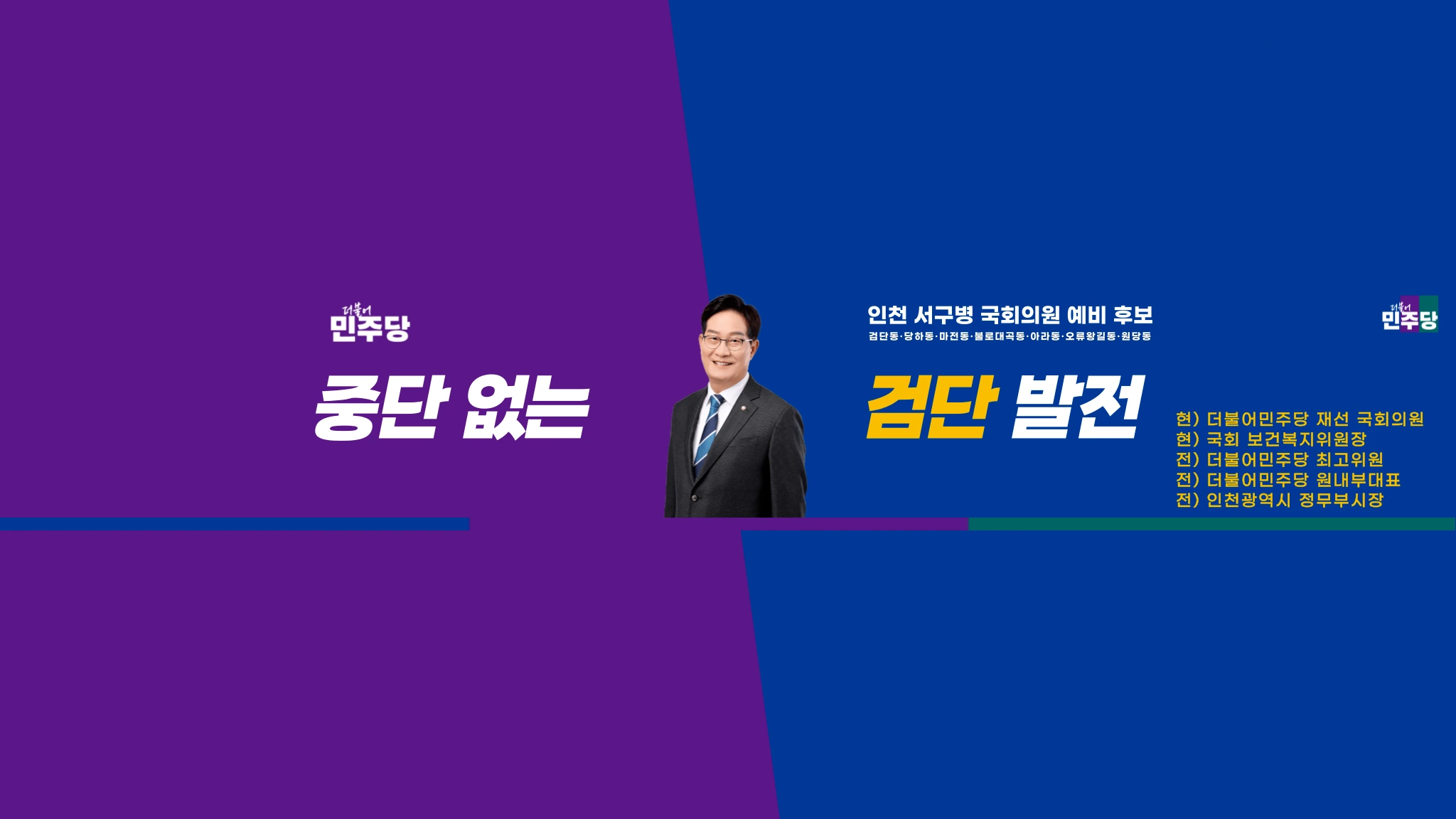 "검증된 필승후보" 신동근 2002년 8.8보궐선거 출마를 시작으로 지금까지 4전5기의 도전 끝에 제20대 국회의원이 된 뚝심있는 정치인 조금 더디 가더라도 소신과 원칙을 지키며 돌파구를 찾아내는 정치인 민주화운동관련 국가유공자로 개혁성을 갖춘 정치인 30년간 인천 서구을을 지켜온, 그 누구보다 지역을 잘 아는 경쟁력 있는 정치인 치과의사 출신으로 전문성을 지닌 정치인 서구의 자존심 신동근! 전) 인천 서구을 국회의원 전) 국회 보건복지위원회 위원장 전) 더불어민주당 최고위원 전) 더불어민주당 원내부대표 전) 인천광역시 정무부시장 전) 신동근 치과의원 원장 민주화운동 관련 국가유공자