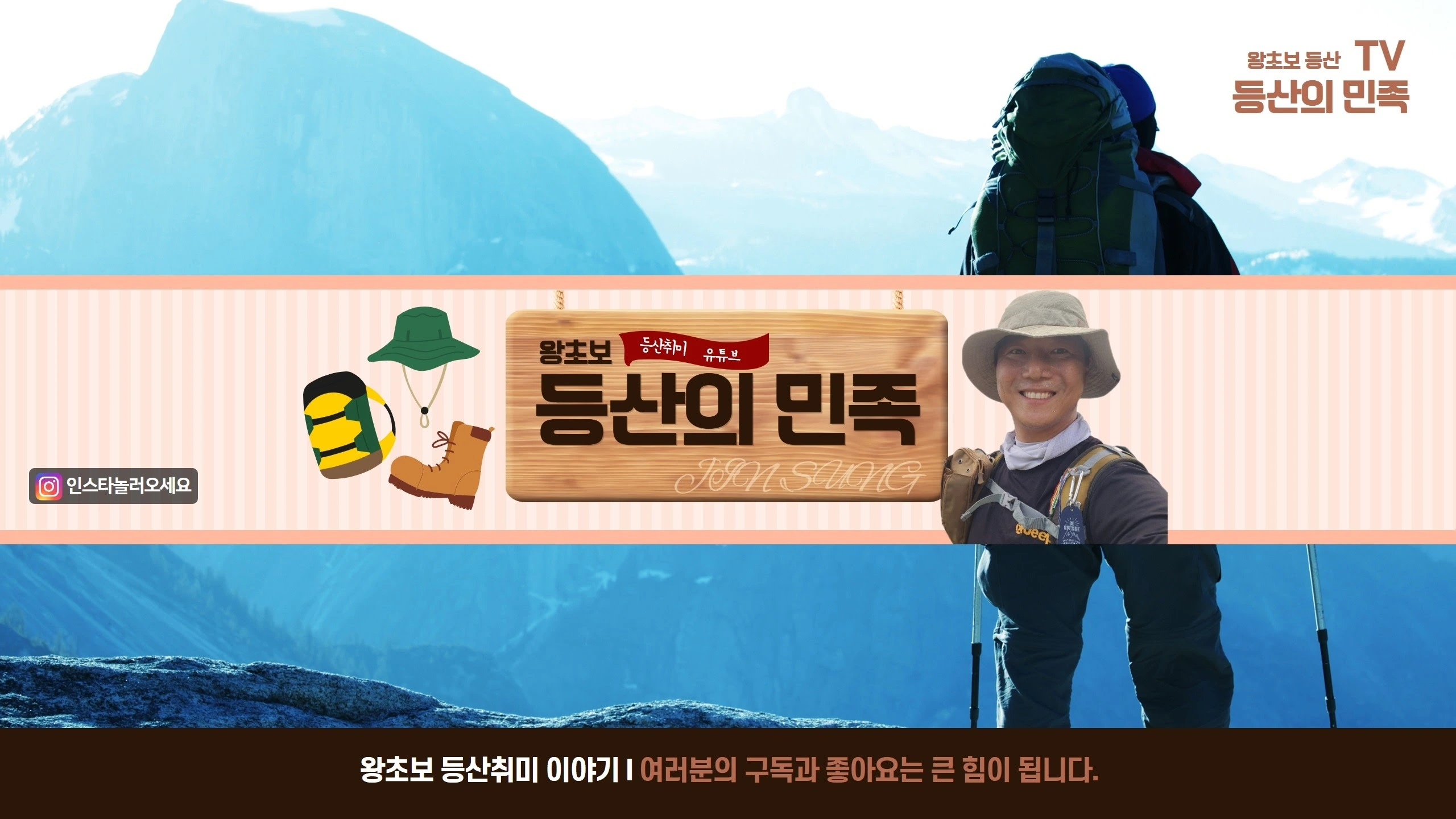 “등산, 어렵게 생각하지 마세요! 누구나 할 수 있습니다. 비싼 등산복, 등산화 없어도 괜찮습니다. 마음만 있으면 누구나 산을 즐길 수 있어요. 등산을 하면 심신이 건강해지고, 폐활량이 늘어나고 근육이 단단해집니다. 고혈압, 당뇨, 고지혈증 같은 생활질환 예방에도 큰 도움이 되죠. 가까운 낮은 산부터, 저 왕초보 등산맨과 함께 시작해보세요. 천천히, 즐겁게, 건강하게~ 여러분도 금방 산에 푹 빠질 겁니다!”