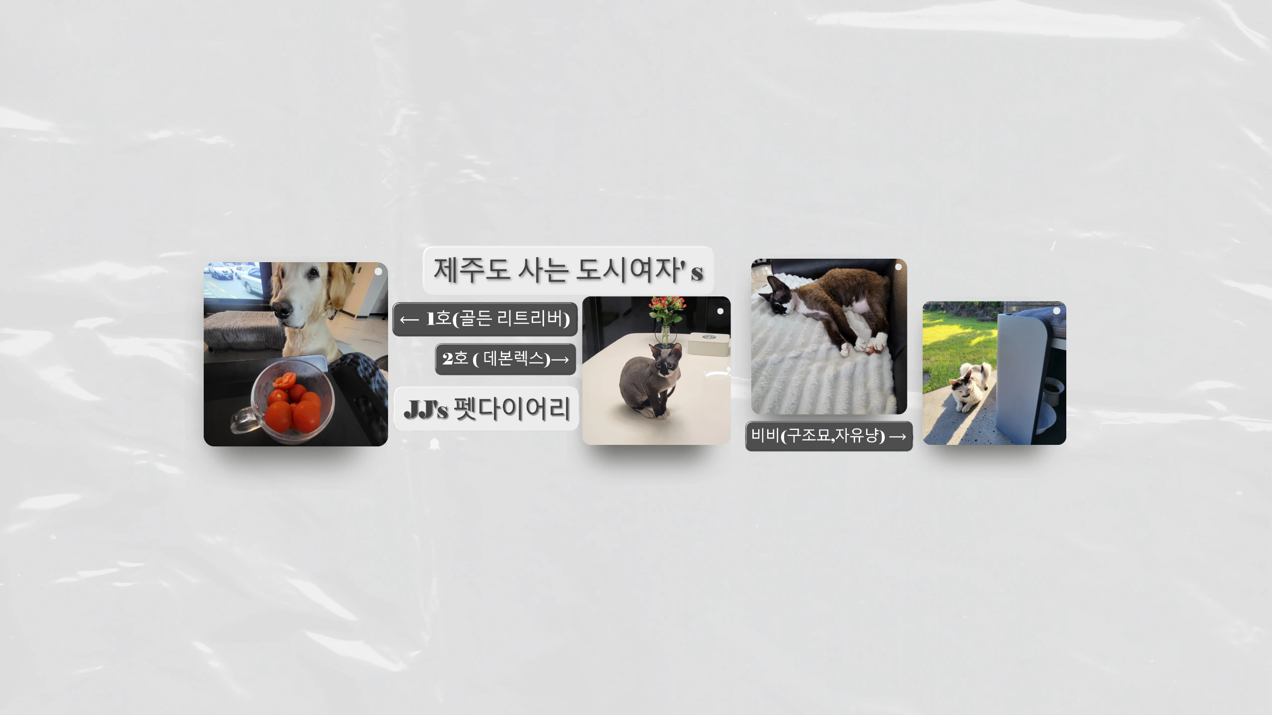 제주도로 이주한 도시여자의 '펫 다이어리' 반려동물(골든리트리버, 데본렉스)과 정원을 오가는 고양이 아이들의 하루를 꾸밈없이 써내려가는 채널입니다. 🤍 1호(골든리트리버)- 겁도 많고 질투도 많은… 덩치만 큰 아기 같은 첫째.(남아, 2015.01.07생) 2호(데본렉스)- 사람 좋아하고 완전 개냥이에 무릎냥. 장난꾸러기 둘째.(남아, 2023.08.18생) 비비- 길 위에서 만난 아이. (남아, 2025.04 발견) 속을 알 수 없는 자유냥. 비비의 친구- 언젠가 부터 매일 오가는 또 다른 자유냥.