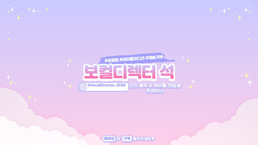 누구나 참여 가능한 무료 오디션 , 현직 프로들의 특강을 개최하고 있습니다. 비용은 대부분 무료이고, 부득이할 경우 최소한의 비용만 받고 있습니다. . . ⭐️현 직업 → 신인 배우 & 아이돌 연습생 보컬 트레이너 ⭐️강남구 삼성동에 1:1 보컬 스튜디오 운영 중 (유료 레슨) . ⭐️합격생 및 연습생 배출 하이브, SM, JYP, 플레디스, FNC, 위에화, MNH, 피네이션 외 다수 . 자세한 커리어가 궁금하다면? 👇 https://blog.naver.com/vocaltraining
