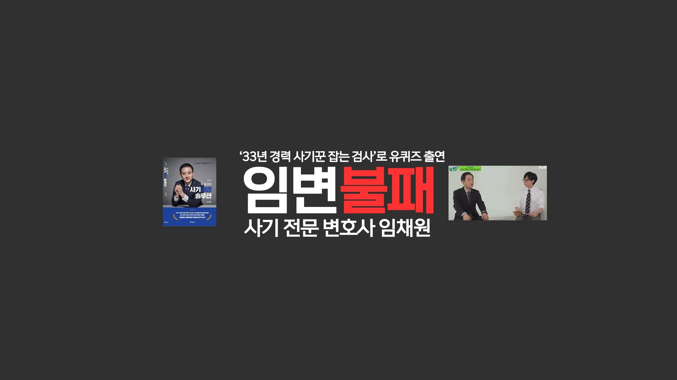 검사 경력 33년인 사기전문/형사전문 변호사 임채원 입니다. 33년간의 수사경험을 토대로 "임검사의 사기예방 솔루션" 을 출판하였고, 현직 검사 시절에는 '33년 경력 사기꾼 잡는 검사'로 유퀴즈온더블럭(제159회, 2022. 6. 29. 유재석 진행)에 출연하였습니다(하단 링크 참조). * 고소인(피해자) 뿐만 아니라 피고소인(가해자)도 상담가능 합니다. * 제가 현직 검사때, 사기 예방을 위하여 차용증[ '기(欺) 찬 차용증]을 만들었으니, 아래 링크에서 다운 받으시기 바랍니다. * 간혹 사기 사건만 하는지를 묻는 분이 있는데, 사기 외의 일반 형사사건, 민사사건도 취급합니다. 법무법인(유한) 민(民) 임채원 대표변호사 대표전화 : 02-6250-0100 이메일 : [email protected] 주소 : 서울 강남구 테헤란로 126. GT대공빌딩 11층 촬영문의 :: 대성TV 010 - 4670 - 3076 031 - 335 - 3076