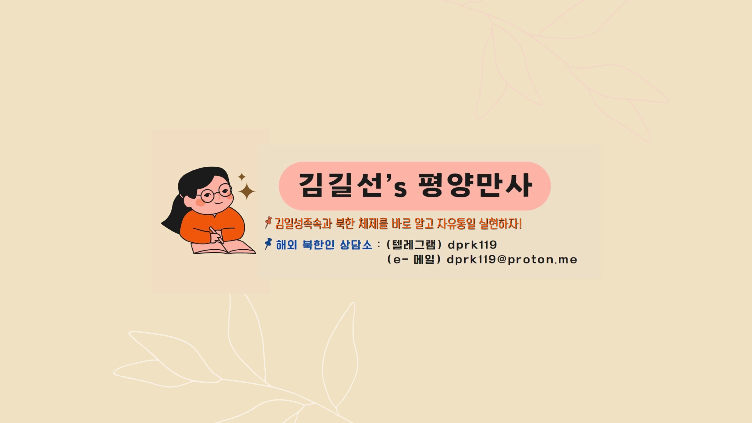 80년의 인위적 분단으로 형성된 북한의 모든 이질적 장벽들을 구석구석 성의 껏 알려드리는 것으로서 언젠 가는 도래할 북한 자유화와 한반도 자유통일 시(時) 남-북민 사이의 이해와 소통에 작게 나마 도움을 드리고자 이 창을 개설하였습니다. 대내외 많은 분들의 관심과 응원 부탁 드립니다. 🚩💥해외 북한인 상담💥 텔레그램: dprk119 E-mail : [email protected] 🚩 평양만사 E-mail 👉 [email protected] ◆월~금(금요일은 격주) 오전 8시 영상 업로드합니다.◆ ◆공휴일에는 영상을 업로드하지 않습니다.◆ ◆금요일 저녁 8시 30분(격주)👉 실시간 방송 진행(90분)◆ 실시간방송은 격주로 진행합니다.(게시물에 공지)