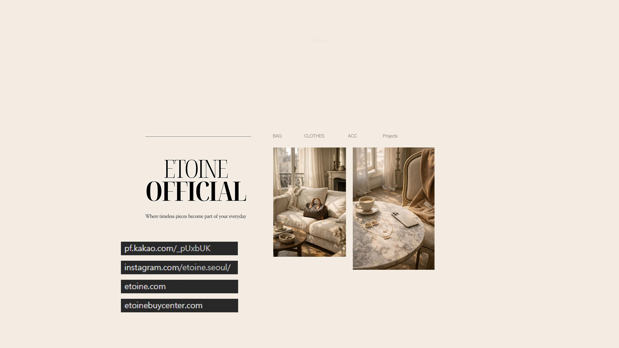 중고명품 & 명품 빈티지샵 매일 새롭게 입고되는 중고 명품 또는 명품 빈티지 가방과 의류를 판매하는 셀렉트 스토어 입니다. 에토네는 정품 검수를 마친 100% 정품만을 판매합니다. 📍취급 브랜드 샤넬 에르메스 루이비통 보테가베네타 디올 프라다 미우미우 발렌시아가 펜디 구찌 입생로랑 셀린느 버버리 지방시 페라가모 발렌티노 고야드 멀버리 마르지엘라 등 가방부터 오브제까지 전 명품 관련 상품 모두 취급합니다✨ 카카오톡 채널 - 에토네 공식인스타그램 : https://www.instagram.com/etoine.seoul 공식사이트 : https://etoine.com/