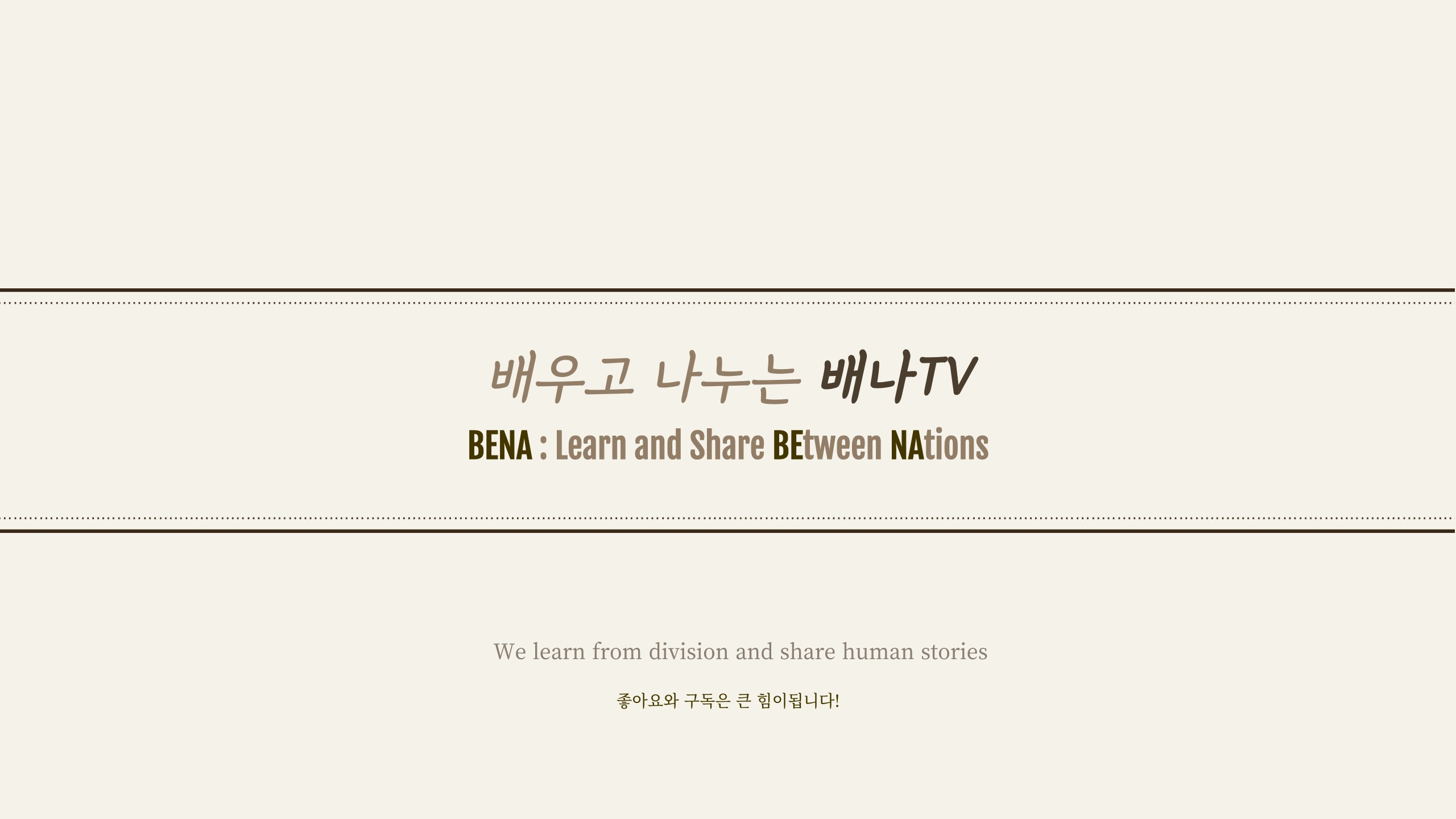 경계를 배우고, 삶을 나눕니다. “BENA” stands for “Learn and Share” BENA, Bridges stories from North Korea with Empathy and Awareness. 공감과 인식을 통해 북한의 이야기를 세상과 잇는 다리가 되고자 합니다. 배나TV는 2014년 6월 15일에 설립된 방송사로, ‘배우고 나누는 TV’의 줄임말입니다. 북한과 탈북민, 국군포로, 고려인 등 경계 너머에서 살아가는 사람들의 이야기와, 그들을 위해 일하는 활동가들의 목소리를 담습니다. BENA TV was founded on June 15, 2014. The name stands for “TV that Learns and Shares.” We share stories of North Korean defectors, Korean War POWs, ethnic Koreans abroad, and those who work to supp