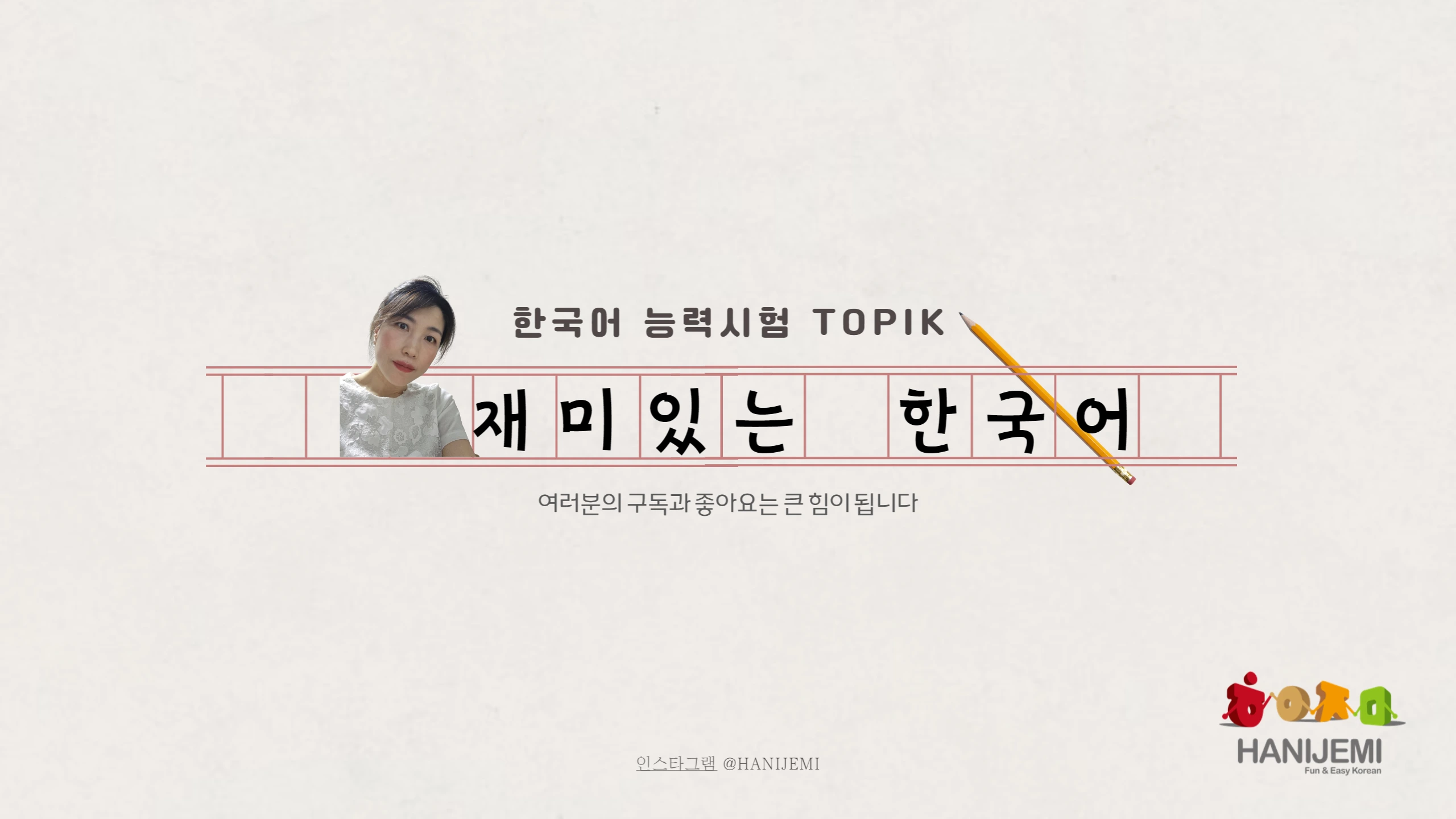 안녕하세요? 한국어를 공부하고 싶은 친구들을 위한 한이재미입니다. 한국어능력시험 기출 문제 풀이, 한국어 발음규칙, 한국어 문법 등 다양한 영상을 준비하고 있습니다. 영상보시고 구독, 좋아요 눌러 주세요. Hello This is Hanijemi for you who want to study Korean. We have prepared a variety of videos for solving the TOPIK questions, Korean pronunciation rules, Korean grammar, etc. Please watch the video and subscribe and like.