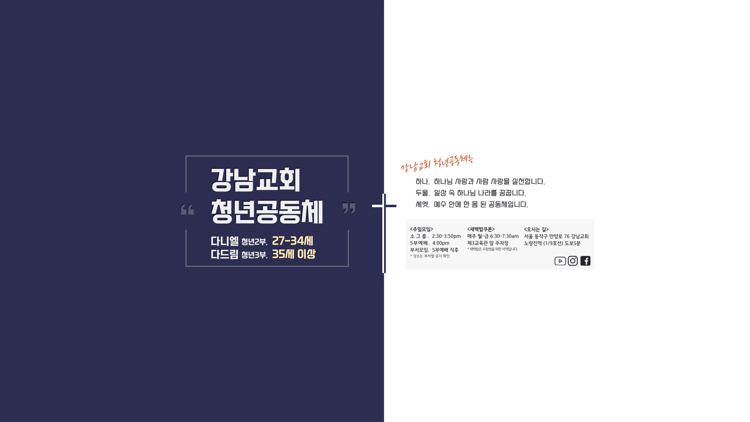 #강남교회 #노량진 #교회 #노량진교회 #노량진강남교회 #청년부 #청년교회 #2청년부 #제2청년부 #다니엘 #다니엘청년부 #3청년부 #청년예배 #2청년예배 - 강남교회 청년 공동체 (다니엘청년부+청년3부 연합 / 주일 예배 : 오후 4시) - 2청년부. 27세 - 34세 3청년부. 35세 부터 - 서울 동작구 만양로76 (1,9호선 노량진역 도보 10분) - 페이스북. https://www.facebook.com/YoungAuldtsKNPC - 인스타. https://www.instagram.com/youngadults_knpc - 유투브. https://www.youtube.com/c/강남교회다니엘청년부 - 팟캐스트. https://podcasts.apple.com/us/podcast/%EA%B0%95%EB%82%A8%EA%B5%90%ED%9A%8C-%EB%8B%A4%EB%8B%88%EC%97%98-%EC%B2%AD%EB%85%84%EB%B6%80-%EA%B9%80%EC%83%81%EC%88%9C-%EB%AA%A9%EC%82%AC-%EC%84%A4%EA%B5%90/id1457280655