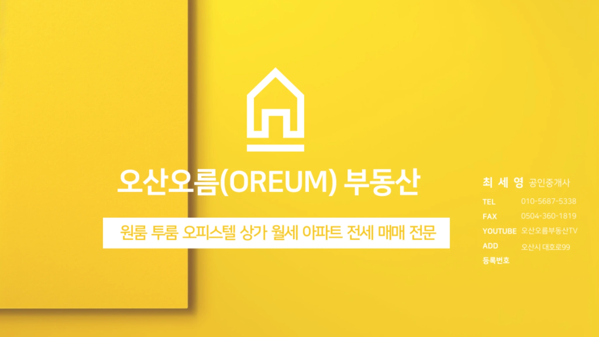 010-5687-5338 이 채널은 오산 지역을 중심으로 한 실시간 부동산 정보, 매물 소개, 투자 분석, 부동산 꿀팁 등을 전달하는 공간입니다. 전문가의 눈으로 바라보는 정확하고 믿을 수 있는 부동산 이야기를 통해 여러분의 소중한 자산 형성과 안정적인 거래를 돕겠습니다. ✔️ 오산 지역 매물 정보 ✔️ 아파트·상가·토지 분석 ✔️ 부동산 계약 및 절차 안내 ✔️ 실거래가 기반 시장 동향 제공 구독과 좋아요는 더 나은 정보를 만드는데 큰 힘이 됩니다! 문의사항은 댓글 또는 채널 소개란의 연락처를 통해 남겨주세요.