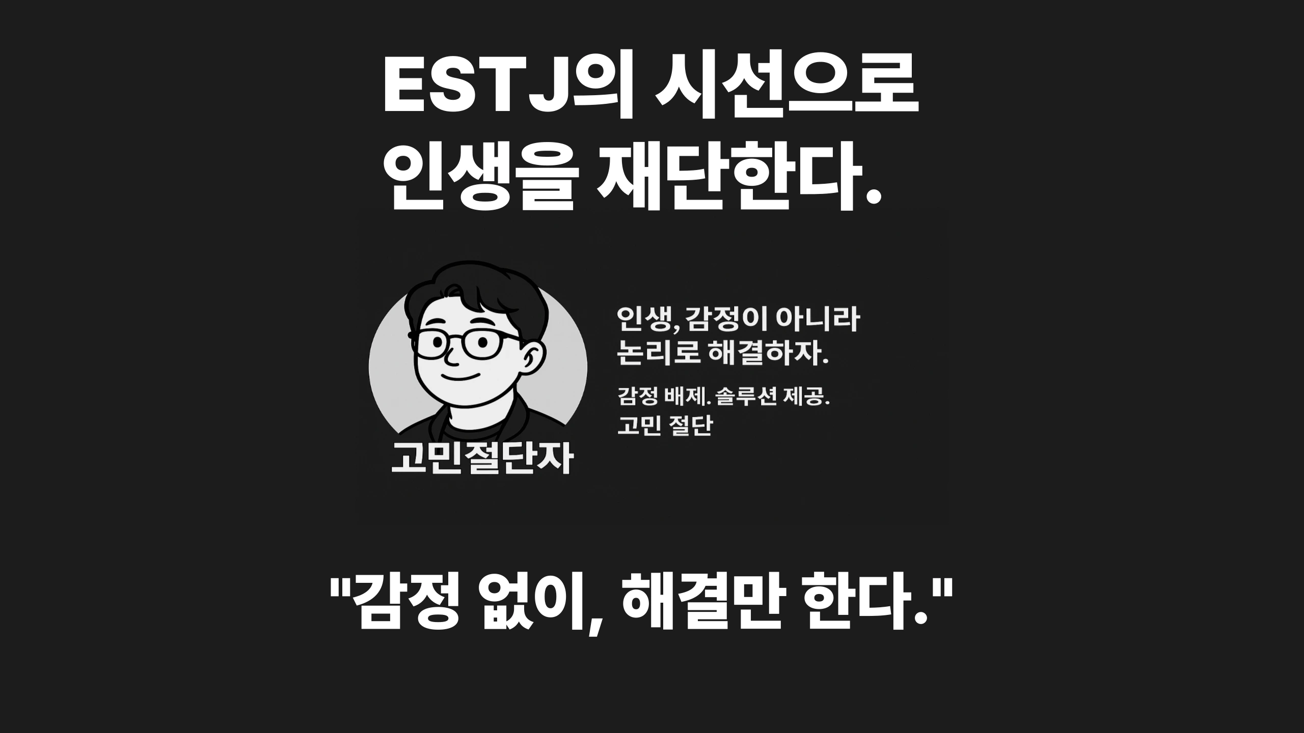 감정 위로? 안 해. 나는 너의 인생을 ‘해결’하러 온 고민절단자야. ✅ 직장, 연애, 인간관계, 돈 ✅ ESTJ 현실주의자 시선 ✅ 남들이 피하는 주제까지 솔직하게 당신의 인생, 내가 논리로 재단한다.
