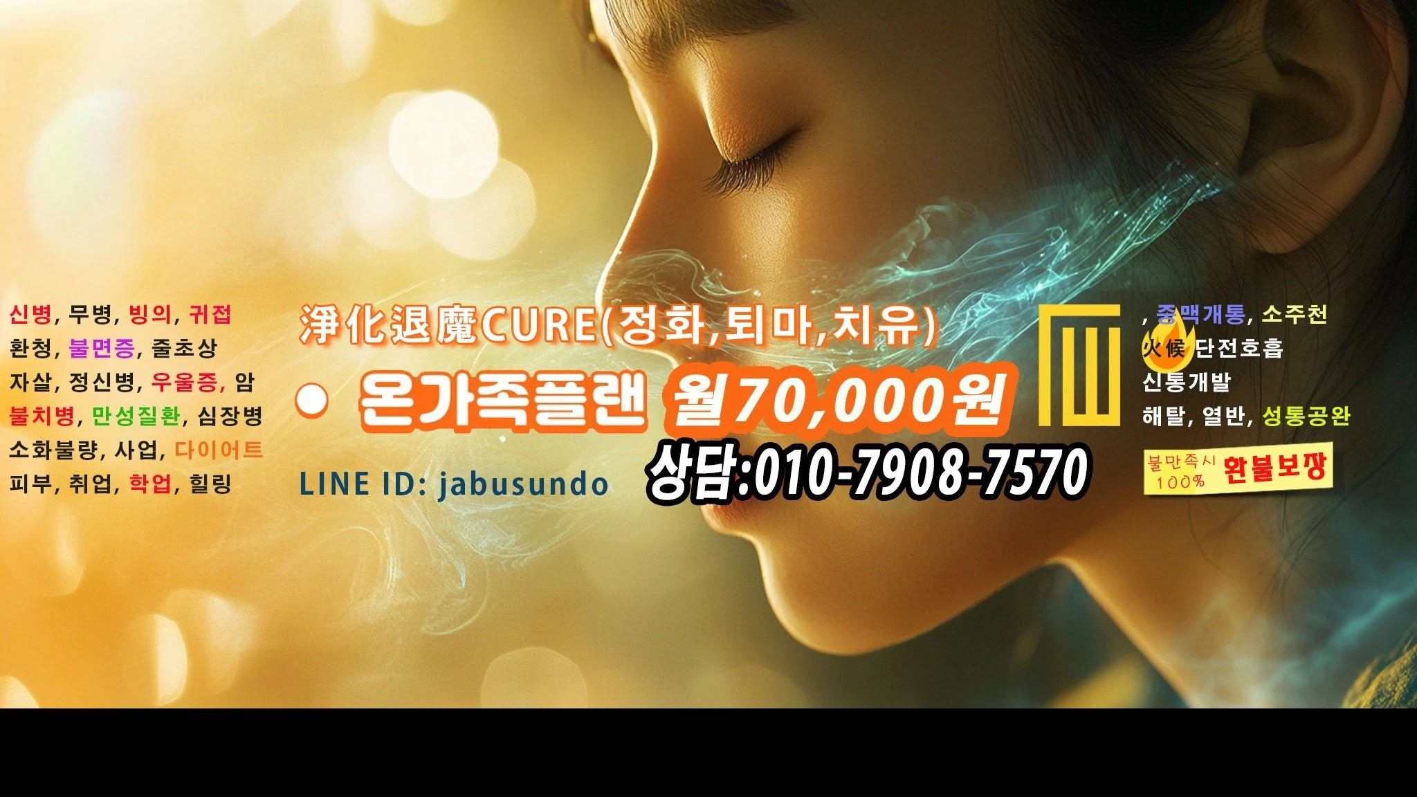 東夷族 伝統仙道・紫府仙道(ジャブセンドウ) https://www.instagram.com/jabusundo/ 1. 苦(く) 神病・巫病・憑依、慢性病の癒し 退魔、除霊、薦度 三災、呪い、殺気の浄化 結界(事業/健康/ダイエット/美容/結婚/相性/不妊/不和 など) 2. 道(どう) 丹田呼吸(火候、湧百)、中脈開通、運気調整、少周天 神通力の開発 解脱、涅槃 📞 相談:+82 10-7908-7570(韓国) 📱 LINE(ID: jabusundo) ♤ ご支援口座: ♤ PayPal:[email protected] -------------------------------------------------------------- 동이족 전통선도, 자부선도(紫府仙道) http://cafe.naver.com/breakoff 1. 苦 (퇴마, 천도, 레이키, 정화, 치유, 힐링) 신병, 무병, 빙의, 환청, 이명, 귀접, 구병시식, 지병 치유, 불화, 금전풍파, 사고수, 인연수, 조현병, 정신병, 줄초상,
